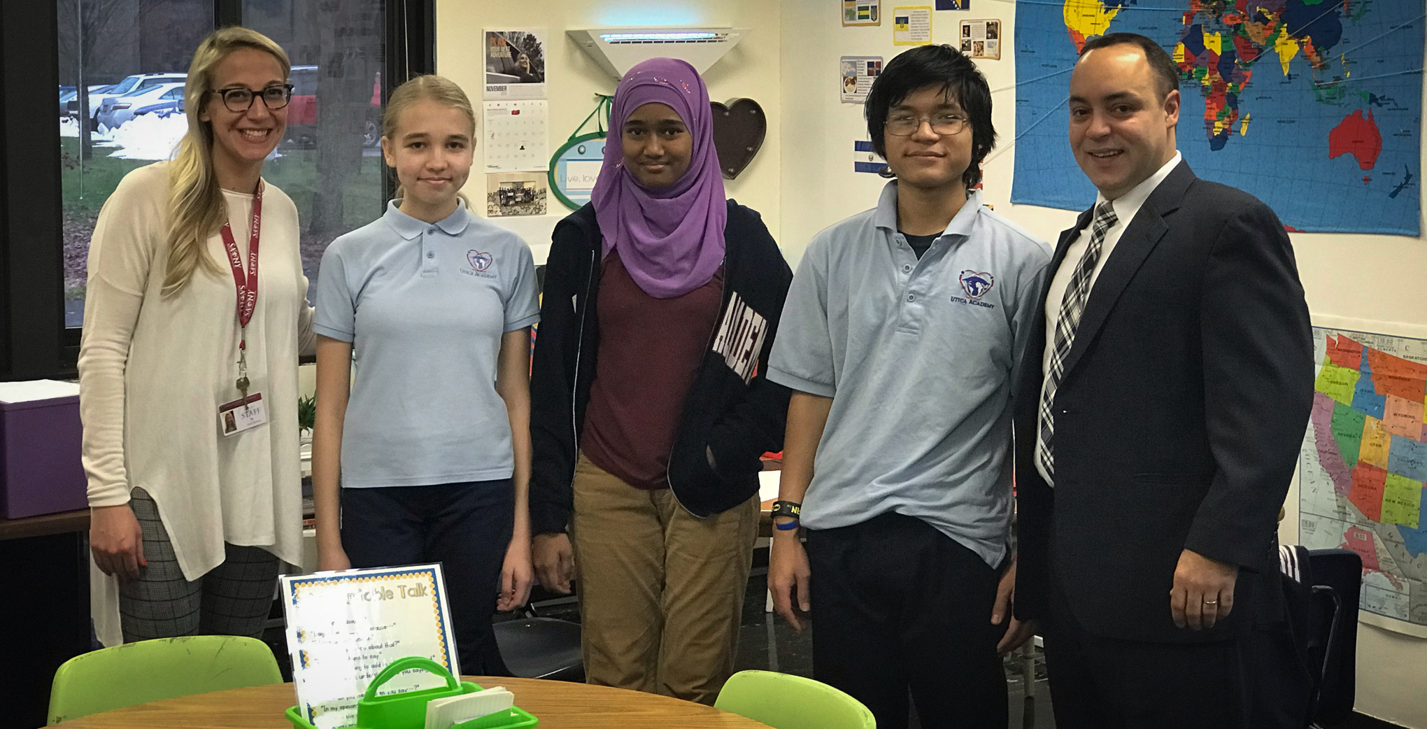 On Monday, November 26, 2018, Utica City 4th District Councilman, Joseph Marino, stopped at #UASCS to tour the elementary and high school. Marino visited our English as a New Language Department, spoke with staff about the work they are doing, and then presented to our ninth grade #UASAtoms. Marino highlighted the value of volunteer work and being an engaged citizen. He then encouraged our #UASAtoms to become active participants within their community. Inviting community leaders to speak to our #UASAtoms is just one of the ways we are building success one ATOM at a time.